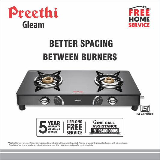 Preethi Blu Flame Gleam GTS-102 Toughened Glass Top Gas Stove, 2 Burner