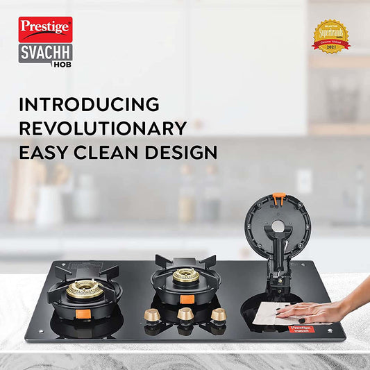 Prestige Svachh Hob PSVH 03 AI Toughened Glass Top Hob Gas Stove with One-Touch Advanced Auto-Ignition, 3 Burners