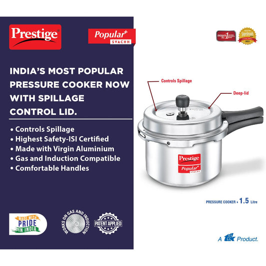 Prestige Popular Plus Svachh Aluminium Induction Base Outer Lid Pressure Cooker, 1.5 Litre