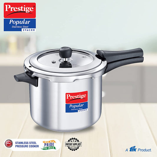 Prestige Popular Stainless Steel Svachh Spillage Control Stainless Steel Induction Base Outer Lid Pressure Cooker, 5 Litres