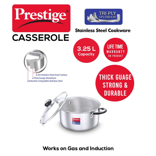 Prestige Tri Ply Splendor Stainless Steel Gas and Induction Compatible Casserole with Glass Lid