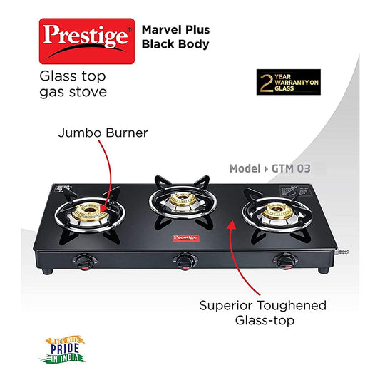 Prestige Marvel Plus GTM 03L Black Toughened Glass Top Gas Stove, 3 Burner