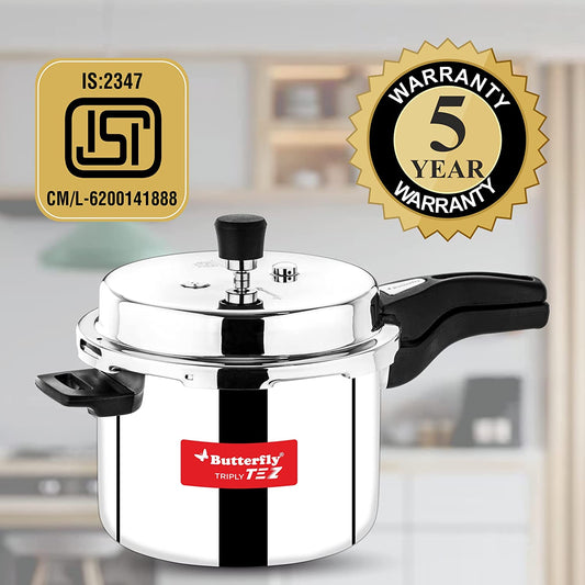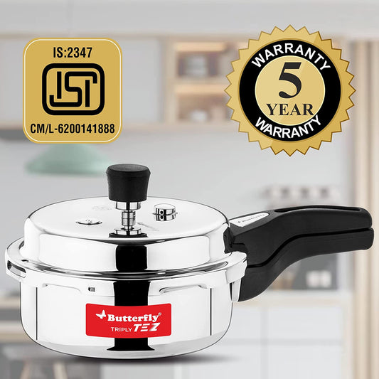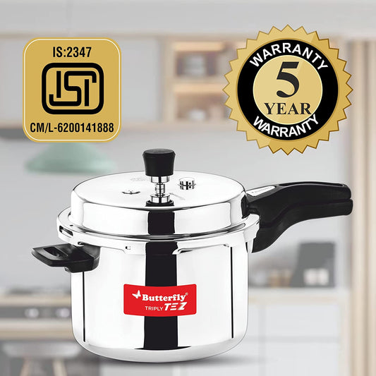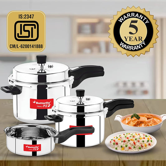 Butterfly Tez Triply Stainless Steel Induction Base Outer Lid Pressure Cooker Combo, 2, 3 & 5 Litres